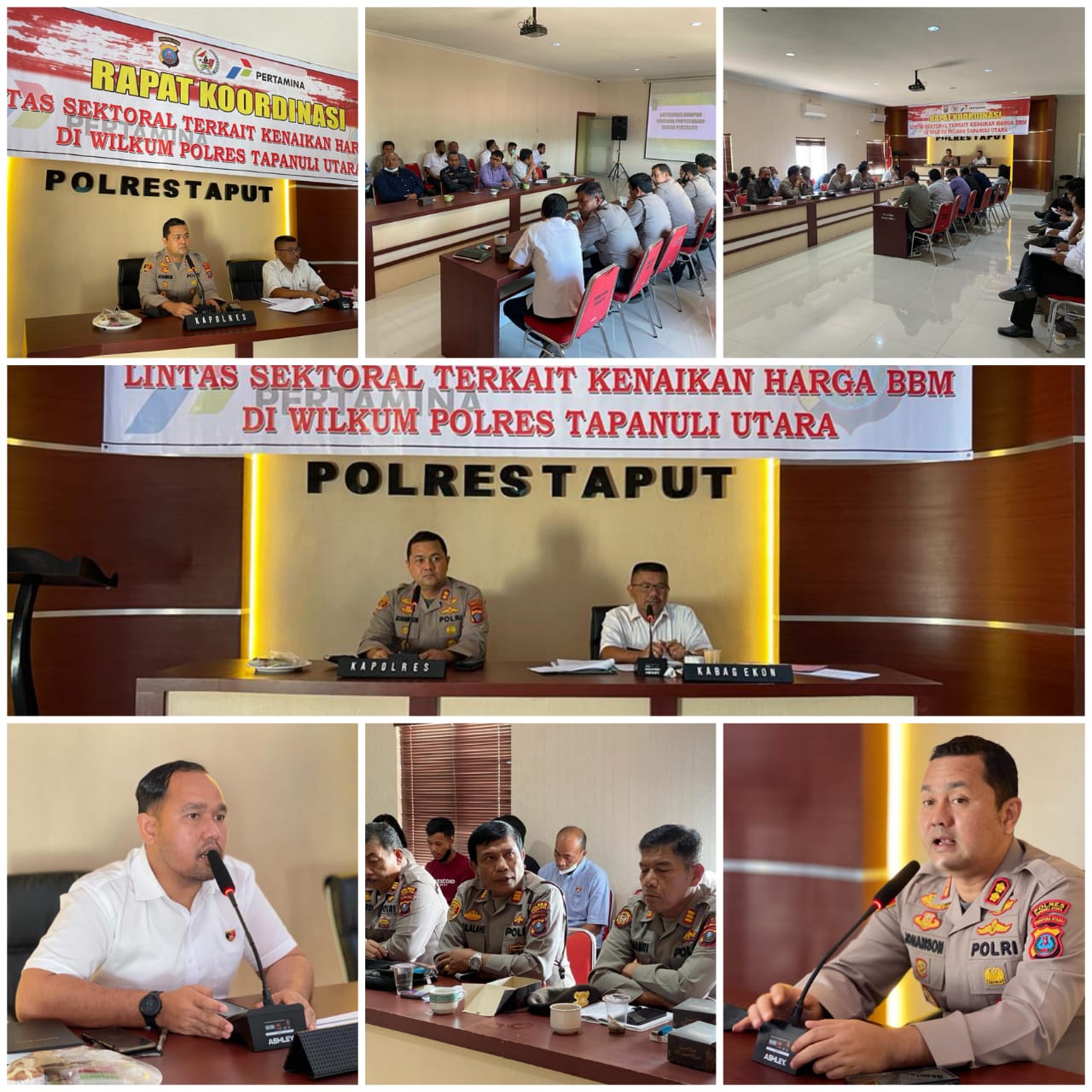 Kapolres Tapanuli Utara AKBP Johanson Sianturi SIK.MH, memimpin Rapat Koordinasi Lintas Sektoral yang melibatkan Bagian perekonomian Setdakab Taput, Dinas Pertanian, Dinas Perindag, Pengawas SPBU Se Kabupaten Taput serta PJU dan Kapolsek se jajaran Polres Taput, dalam menyikapi rencana kenaikan harga BBM, Rabu, 31 Agustus 2022 di Aula Tribrata Polres Tapanuli Utara.