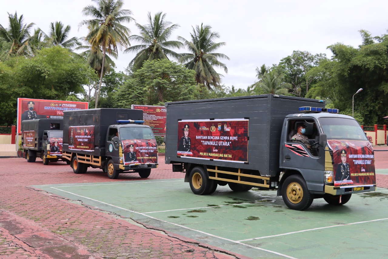 “Hari ini kita memberangkatkan Bantuan Sosial ke kabupaten Tapanuli utara Semen 500 sak, seng 200 lembar dan Kayu 1 kubik untuk korban Gempa bumi yang terjadi tanggal 01 Oktober kemaren, bantuan sosial ini wujud kepedulian Polri khusus Polres Madina kepada saudara-saudara yang di taput”. Terang Kapolres.
