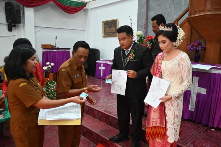 Kadis Dukcapil (Kependudukan dan Pencacatan Sipil) Kabupaten Humbahas Jara Trisepto Lumbantoruan, S.Pd bersama stafnya Asnita Natalia Purba, SH serahkan dokumen kependudukan kepada pasangan pengantin baru di gereja GKPI Doloksanggul 1 Jalan Sentosa Pasar Doloksanggul. Pengantin baru yang menerima dokumen kependudukan berupa KTP, Akta Perkawinan dan Kartu Keluarga (KK) adalah pasangan Harri Santra Josep Gultom, SE dengan Ns.Tresa Mona Tamara, S.Kep. Dinas Dukcapil juga memberiklan KK perubahan untuk kedua orangtua mempelai (six in one).