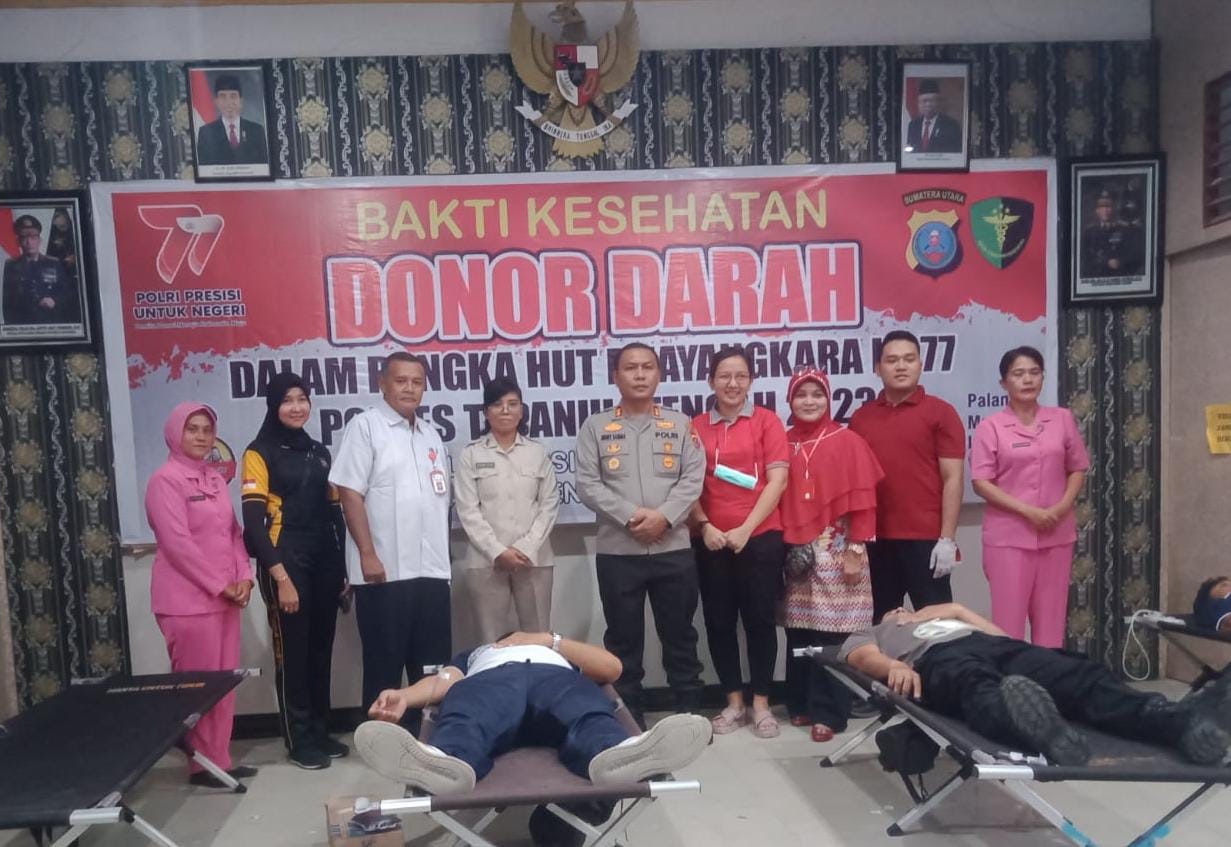Menyambut HUT Bhayangkara Ke 77 Tahun 2023 Polres Tapteng lakukan Bakti Kesehatan Donor Darah Yang dilaksanakan di Aula Pratama Polres Tapteng, Jumat (17/6/2023) Siang
