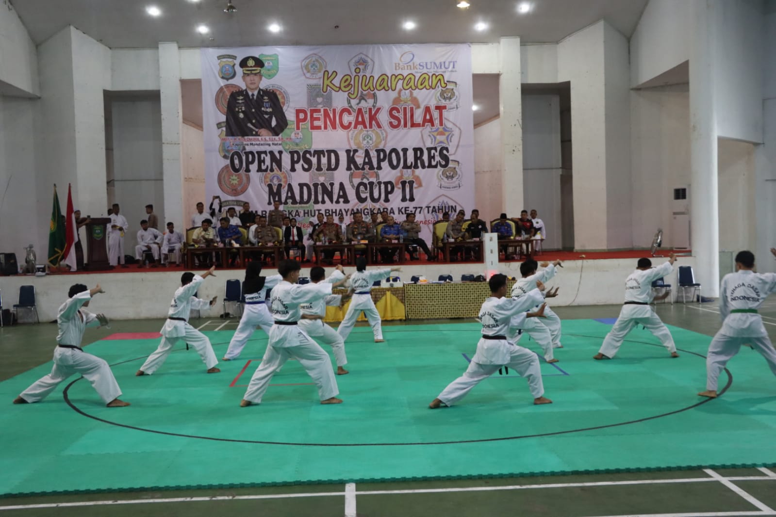 Dalam rangka HUT Bhayangkara Ke-77, Polres Mandailing Natal menggelar Kejuaraan Pencak Silat Open PSTD Kapolres Madina Cup II 2023. Senin, (17/07/2023).