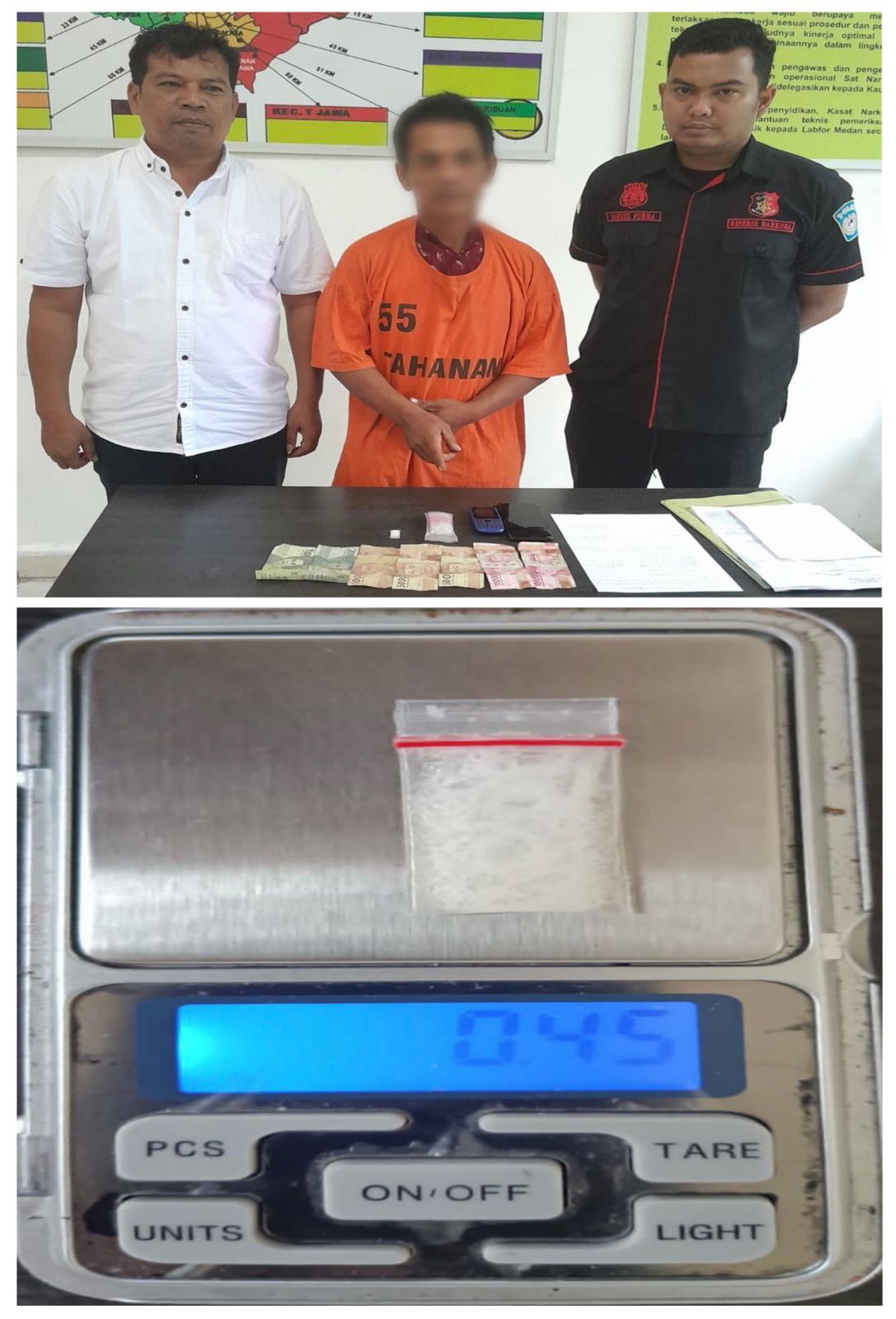 Lebih lanjut Julipan mengungkapkan, “MN(40)” yang berprofesi sebagai pengangguran ini ditangkap di kamar 25 Penginapan Pelangi, Huta I Nagori Perlanaan, Kecamatan Bandar, Kabupaten Simalungun. Ditemukan barang bukti berupa satu bungkus plastik klip transparan yang berisi diduga narkotika jenis shabu-shabu dengan berat brutto 0,45 gram, satu plastik klip besar berisi 80 plastik klip kosong, dua unit ponsel merek Vivo dan Nokia, serta uang tunai sejumlah Rp. 218.000,-.
