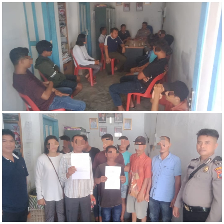 Personil Bhabinkamtibmas dari Polsek Onanrunggu, Brigadir Gunawan Situmorang, bersama perangkat Desa Harian, Kecamatan Onanrunggu, menggelar mediasi antara pelaku dan korban pencurian ayam di kantor desa setempat. (30/07/2024)