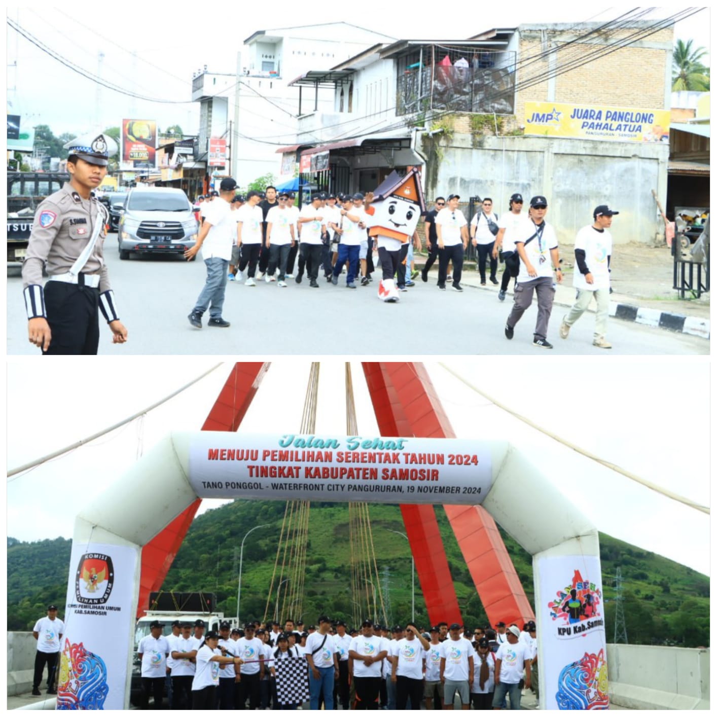 Jalan sehat ini dimulai dari Jembatan Tano Ponggol dan menempuh rute yang mencakup sejumlah jalan utama di Pangururan hingga finis di Air Menati Water Front City. Komisioner Divisi Data dan Perencanaan KPU Samosir, Rastioma Simanullang, mengibarkan bendera sebagai tanda dimulainya kegiatan.