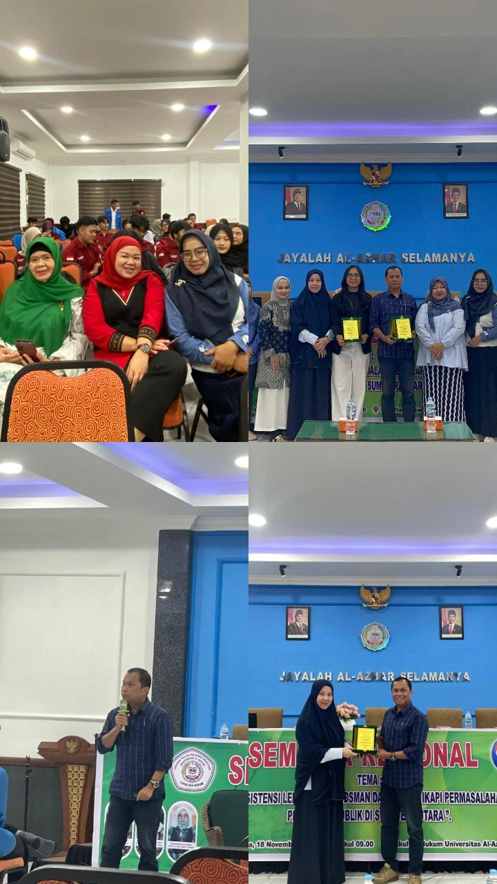 Fakultas Hukum Universitas Al Azhar bersama Ikatan Mahasiswa Hukum Al Azhar (IMAHA) sukses menyelenggarakan Seminar Regional bertema “Eksistensi Lembaga Ombudsman dalam Menyikapi Permasalahan Pelayanan Publik di Sumatera Utara.” Kegiatan ini dihadiri oleh civitas akademika Universitas Al Azhar dan para narasumber kompeten di bidangnya.