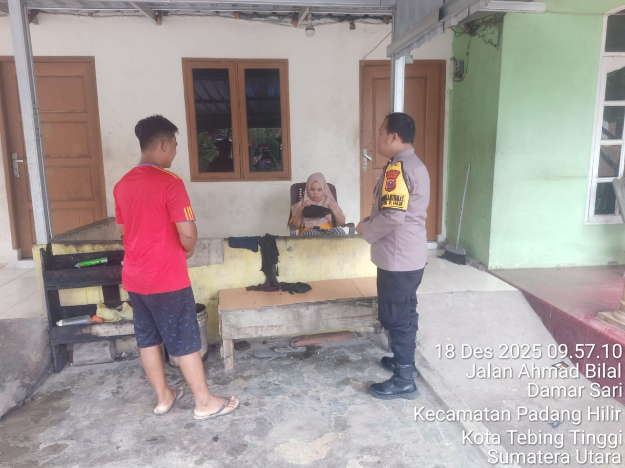 Bhabinkamtibmas Polsek Padang Hilir Polres Tebing Tinggi Aipda P Nadeak melaksanakan sambang DDS dan menyampaikan pesan kamtibmas kepada warga Jalan H Ahmad Bilal Kelurahan Tebing Tinggi Kecamatan Padang Hilir, Kota Tebing Tinggi, Kamis (18/12/2025).
