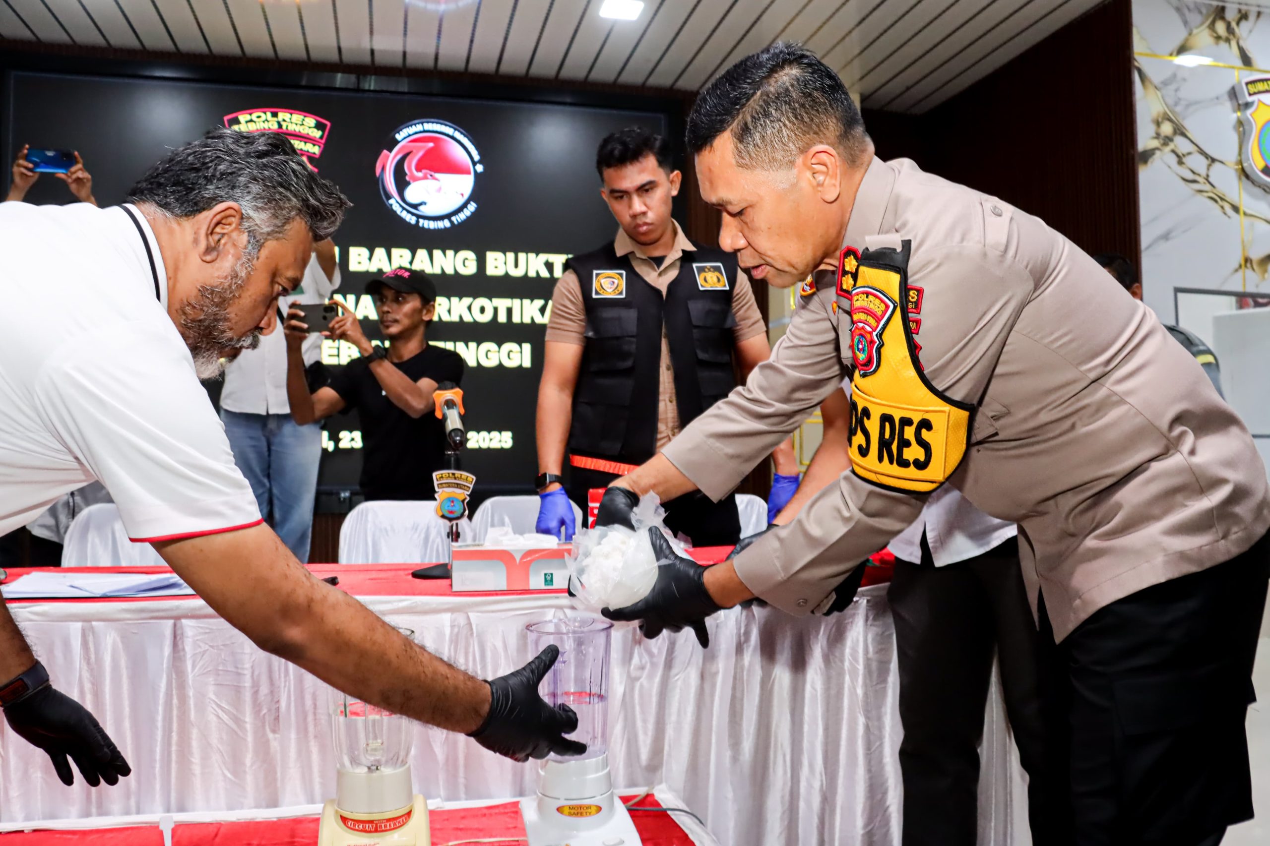 Kapolres Tebing Tinggi AKBP Drs. Simon Paulus Sinulingga, S.H. memimpin langsung pemusnahan barang bukti narkotika jenis sabu seberat 1 kilogram, Selasa (23/12/2025) sekitar pukul 10.00 Wib. Kegiatan tersebut berlangsung di aula Kamtibmas Polres Tebing Tinggi.