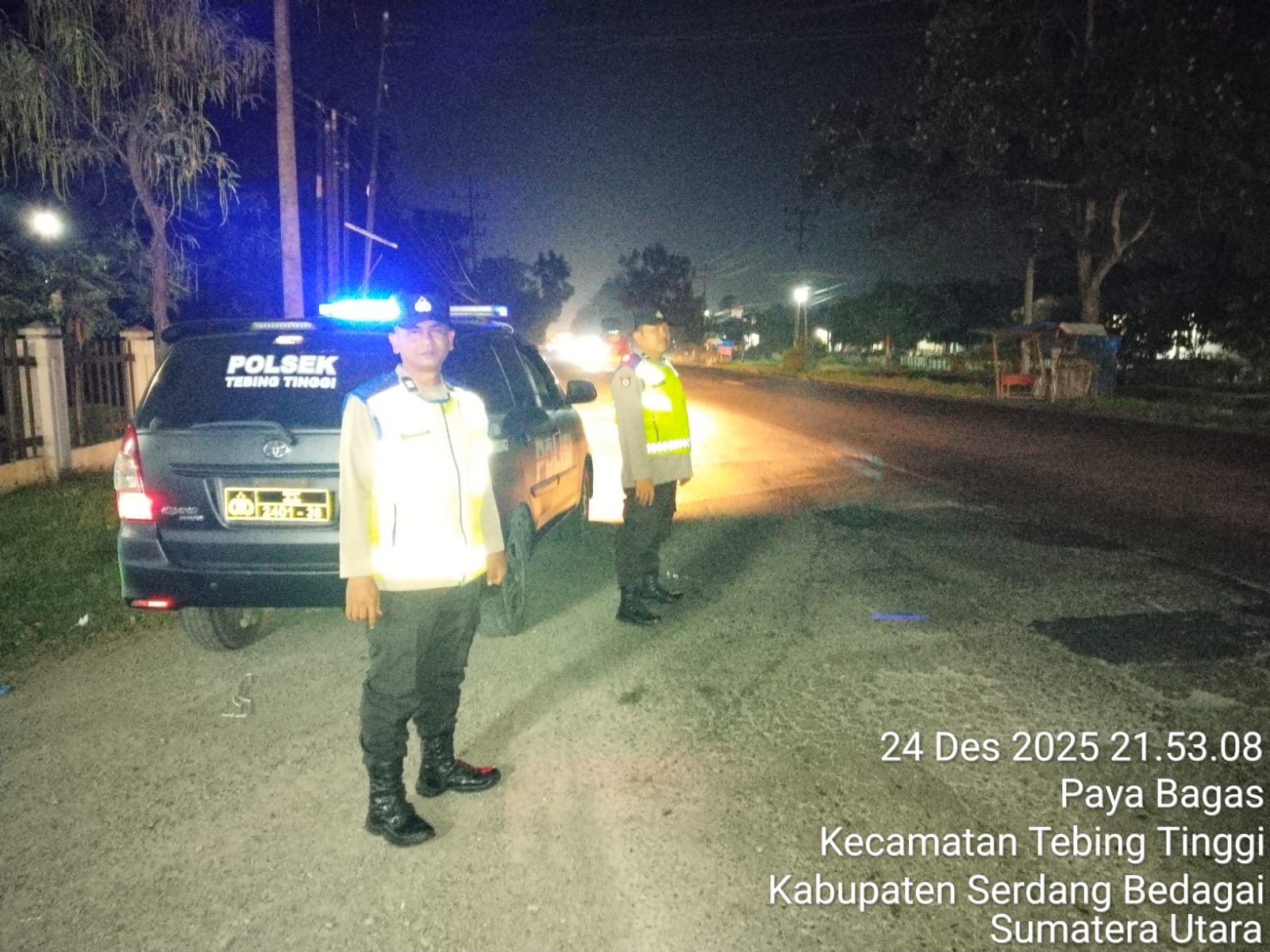 Personel Polsek Tebing Tinggi Resor Tebing Tinggi Aiptu Sutarno, Aipda L Maharaja dan Aipda A Sembiring melaksanakan patroli blue light sebagai bentuk antisipasi tindak kriminal dan kejahatan jalanan pada malam hari yang berlangsung di sejumlah lokasi wilayah hukum Polsek Tebing Tinggi, Rabu malam (24/12/2025).