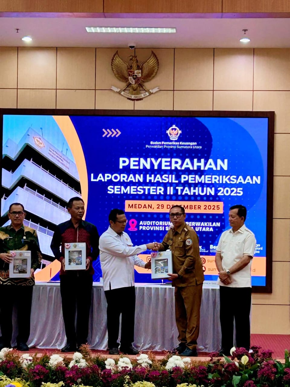Bupati Tapanuli Utara, Dr. Jonius Taripar Parsaoran Hutabarat, S.Si., M.Si., menghadiri acara Penyerahan Laporan Hasil Pemeriksaan (LHP) Kepatuhan atas Kegiatan Peningkatan Sarana dan Prasarana Pendidikan yang dilaksanakan oleh Badan Pemeriksa Keuangan Republik Indonesia Perwakilan Provinsi Sumatera Utara. Kegiatan tersebut berlangsung di Auditorium BPK Perwakilan Provinsi Sumatera Utara, Jalan Imam Bonjol Nomor 22 Medan, Senin (29/12/2025).