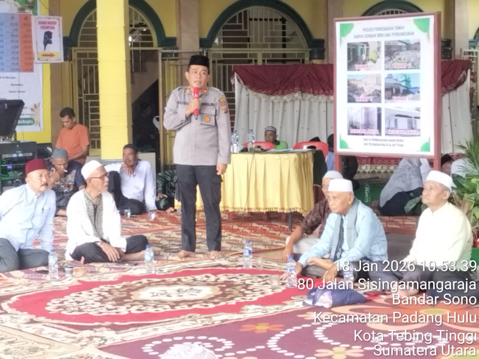 Kapolres Tebing Tinggi yang diwakili Kapolsek Padang Hulu AKP Rudi Asman, SH menghadiri kegiatan Tabligh Akbar dalam rangka memperingati Isra Mi’raj Nabi Muhammad SAW 1447 H yang dilaksanakan di Masjid Al Muttaqin, Jalan Sisingamangaraja Kelurahan Bandar Sono, Kota Tebing Tinggi, Minggu (18/1/2026).