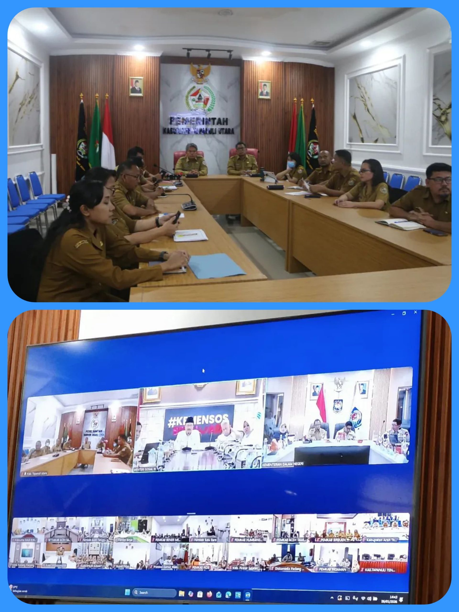 Wakil Bupati Tapanuli Utara, Dr. Deni Parlindungan Lumbantoruan, M.Eng., mengikuti rapat pembahasan penyaluran bantuan rumah dan bantuan sosial pascabencana yang dilaksanakan secara daring, di Aula Mini Kantor Bupati Tapanuli Utara, Senin (26/1/2026).