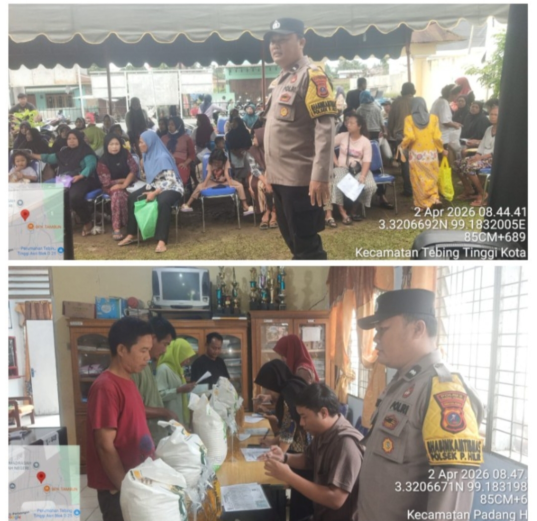 Bhabinkamtibmas Polsek Padang Hilir Aipda P. Nadeak monitoring penyaluran bantuan bahan pangan dari pemerintah. Penyaluran bantuan ditujukan kepada warga di Kelurahan Tebing Tinggi Kecamatan Padang Hilir, Kota Tebing Tinggi, Kamis pagi (2/4/2026).