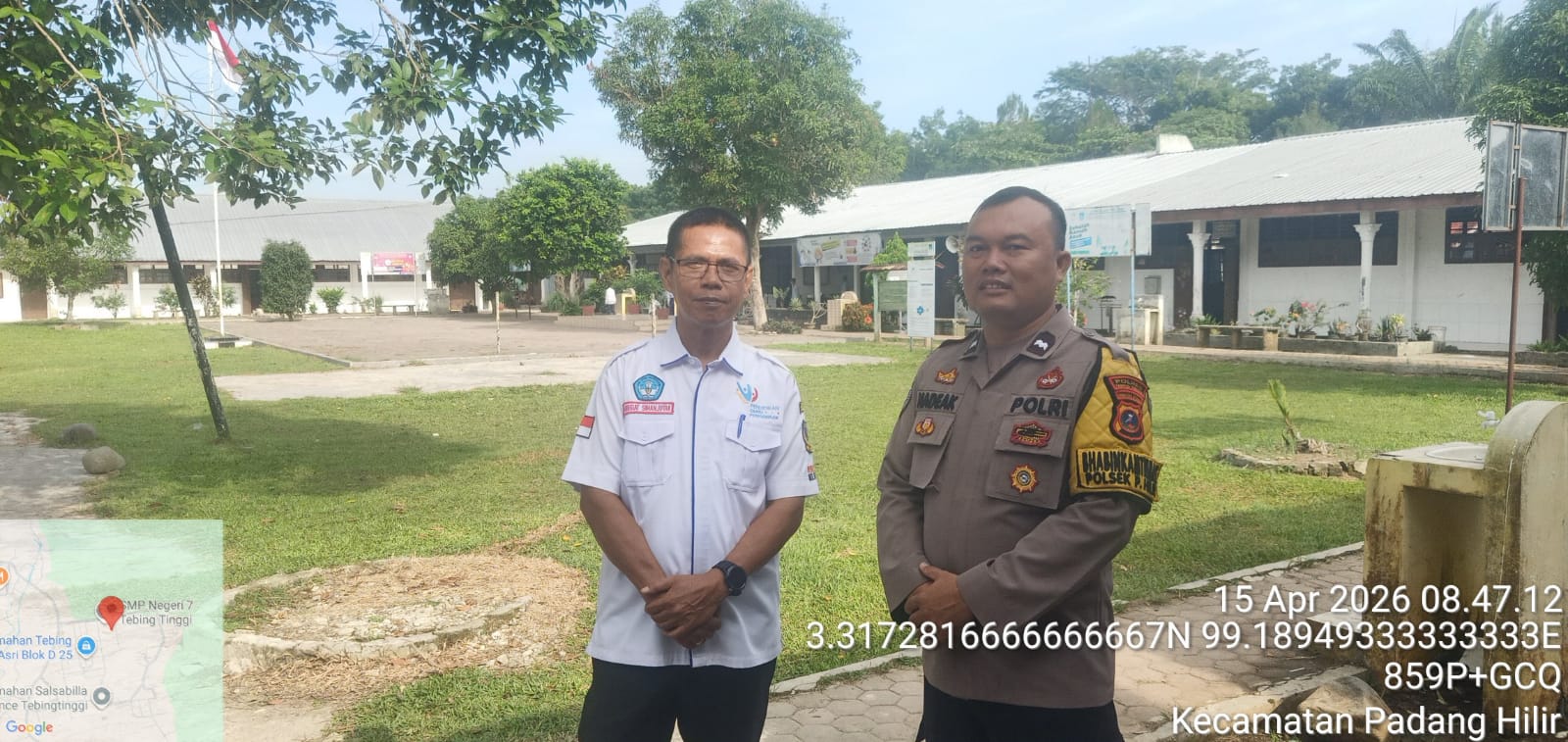 Bhabinkamtibmas Polsek Padang Hilir Polres Tebing Tinggi Aipda P Nadeak melaksanakan sambang dan koordinasi untuk kegiatan upacara bendera di SMPN 7, Jalan Penghulu Tarif Lk. 5 Kelurahan Tebing Tinggi Kecamatan Padang Hilir Kota Tebing Tinggi, Rabu (15/4/2026).