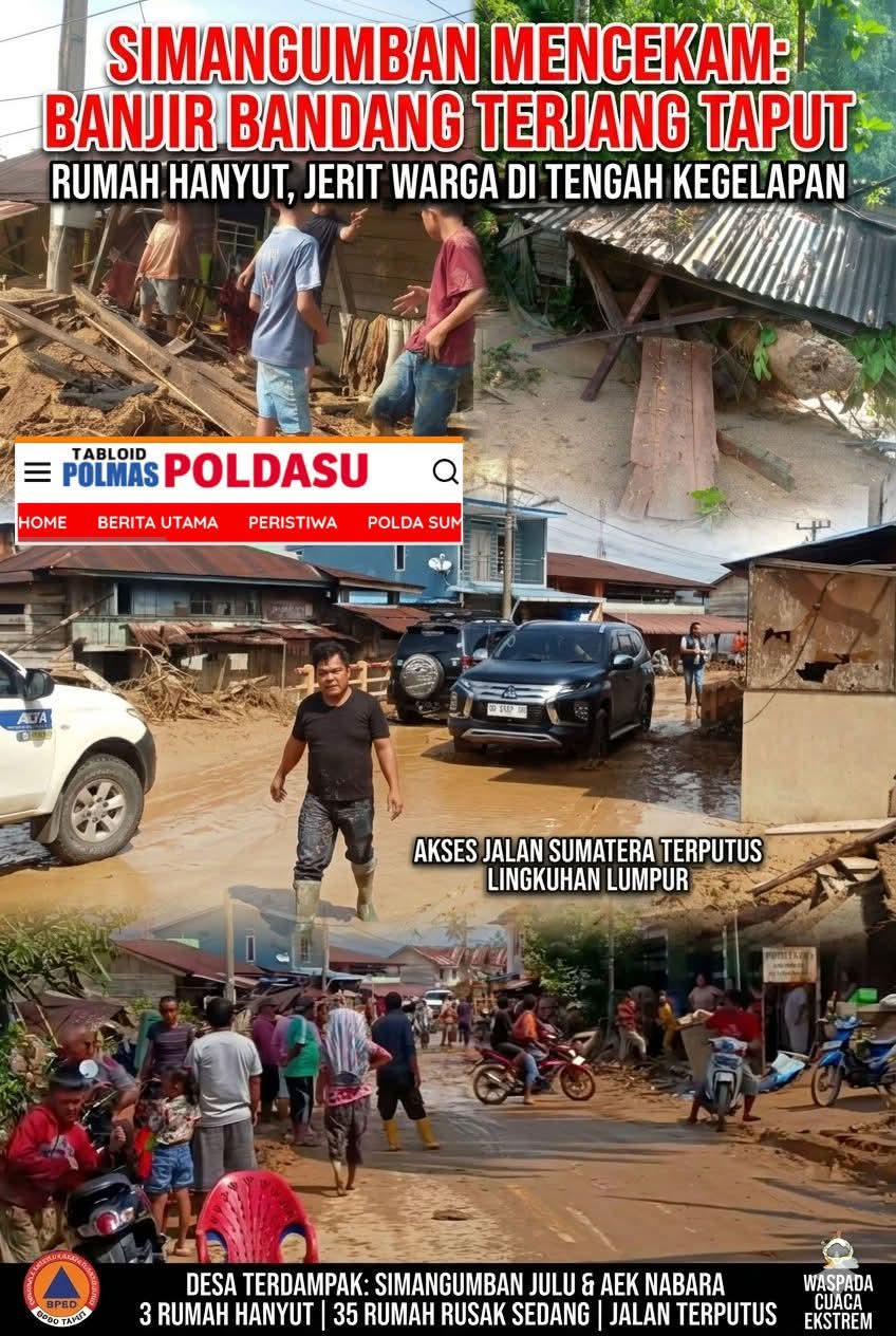 Hujan deras yang mengguyur Kecamatan Simangumban sejak Rabu sore (22/4) memicu banjir bandang yang menerjang permukiman warga di Desa Simangumban Julu dan Desa Aek Nabara, Kabupaten Tapanuli Utara.